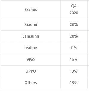 Here’s the chart ranking the most popular phone brands in India by no. of phones sold per quarter,